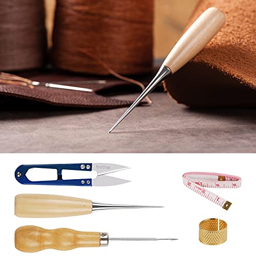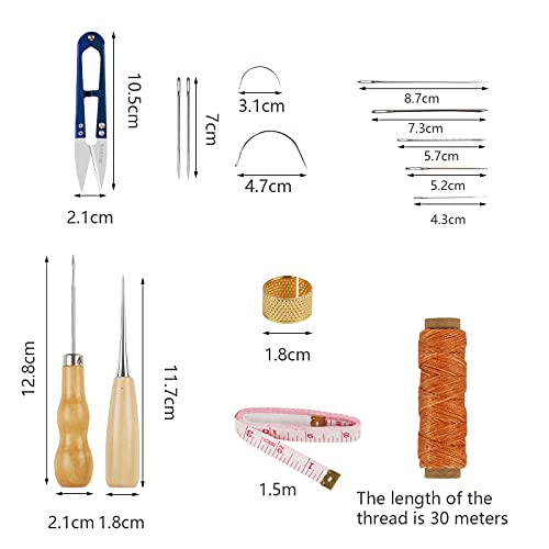 Set da cucito: Il set include 8 * filo di cera per pelle, 7 * ago per cucire in pelle, 2 * ago per materasso curvo, 1 * strumento per cucire perforato, 1 * punteruolo, 1 * ditale, 1 * nastro adesivo, 1 * forbici per filo.