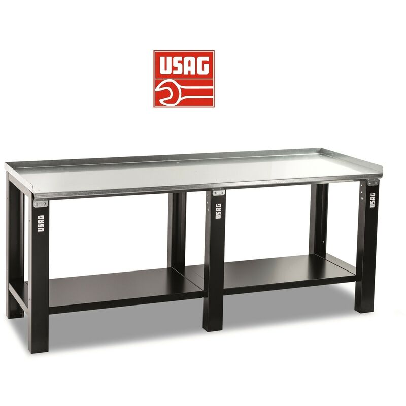 USAG BANCO DA LAVORO BANCONE TAVOLO 2 METRI 506 TA ACCIAIO PROFESSIONALE BANCO DA LAVORO CON PIANO IN ACCIAIO MODELLO 506 TA DESCRIZIONE Piano di lavoro in lamiera d'acciaio spessore 3 mm Bordi anticaduta con altezza 37 mm su 3 lati Montanti e ripiano inferiore in lamiera d'acciaio spessore 1,2 mm Struttura verniciata colore nero RAL 9005 Fori laterali per il fissaggio di più banchi affiancati Predisposizione per il fissaggio a pavimento 6 montanti per il modello di lunghezza 2 metri Possibilità di montare il cassetto 506 TC1 Portata statica: 2000 Kg Spazio tra due montanti: 864 mm Spazio tra il ripiano di appoggio ed il piano di lavoro: 570 mm CARATTERISTICHE DEL PRODOTTO CODICE - U05060056 MISURE - LxPxH mm 2000x700x860 PESO - 75 KG
