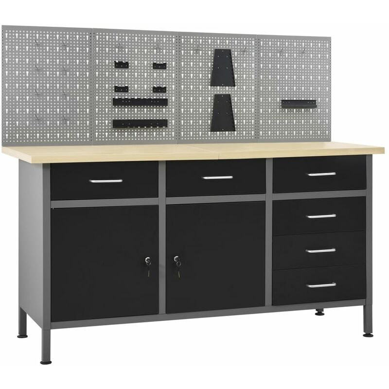 Questo set combina 1 banco da lavoro e 4 pannelli a parete e rappresenta una soluzione comoda per riporre gli attrezzi nell'officina o nel garage. Il banco di lavoro robusto, si distingue per l'ampio spazio di stoccaggio e la capacità di carico di 500 kg. Questo tavolo grande e robusto offre una piattaforma stabile per tutti i lavori di riparazione. Il banco da lavoro ha 6 cassetti, che consentono di organizzare bene strumenti, parti e accessori come viti, chiodi e nastro adesivo. Tutti i cassetti sono dotati di meccanismo di cuscinetti a sfere per uno scorrimento regolare. Ci sono 2 ripiani e un ampio scomparto con 2 ante bloccabili, per ospitare trapani, tamburi per cavi e smerigliatrici. Inoltre, i piedi sono regolabili in altezza. Questa workstation è realizzata in acciaio e truciolare di alta qualità, il che la rende estremamente robusta, resistente e facile da pulire. È facile da montare. Questi pannelli per utensili sono realizzati in acciaio robusto per sostenere il peso di