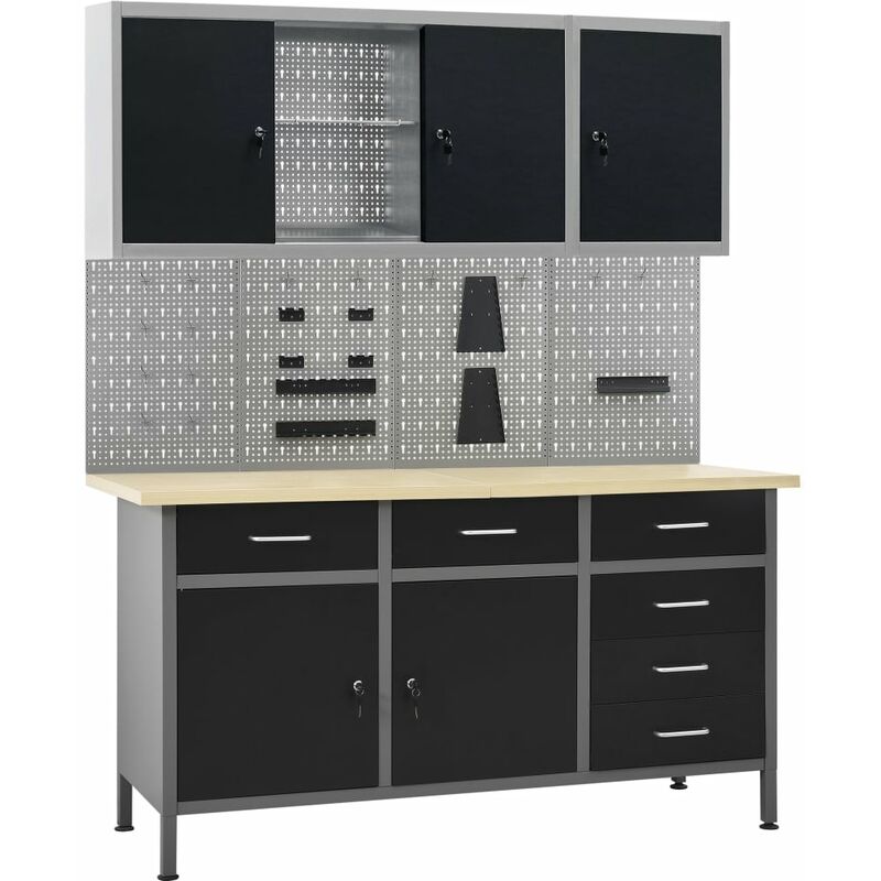 Questo set è la combinazione tra 1 banco da lavoro, 4 pannelli a parete e 2 pensili, che costituiranno una pratica soluzione di stoccaggio per la vostra officina e garage. Il banco di lavoro robusto, si distingue per l'ampio spazio di stoccaggio e la capacità di carico di 500 kg. Questo tavolo grande e robusto offre una piattaforma stabile per tutti i lavori di riparazione. Il banco da lavoro ha 6 cassetti, che consentono di organizzare bene strumenti, parti e accessori come viti, chiodi e nastro adesivo. Tutti i cassetti sono dotati di meccanismo di cuscinetti a sfere per uno scorrimento regolare. Ci sono 2 ripiani e un ampio scomparto con 2 ante chiudibili a chiave, che possono ospitare facilmente trapani, tamburi per cavi e smerigliatrici. Inoltre, i piedi sono regolabili in altezza. Questa workstation è realizzata in acciaio e truciolare di alta qualità, il che la rende estremamente robusta, resistente e facile da pulire. è facile da montare. Questi pannelli per utensili sono