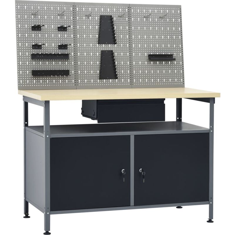 Questo prodotto combina 1 banco da lavoro e 3 pannelli a parete e rappresenta una soluzione comoda per riporre gli attrezzi nell'officina o nel garage. Il banco da lavoro robusto, si distingue per l'ampio spazio di stoccaggio e la capacit� di carico di 300 kg. Questo banco da lavoro ha uno scompartimento aperto dotato di un cassetto, che consente di organizzare bene strumenti, parti e accessori come viti, chiodi e nastro adesivo. Ci sono 2 ripiani e un ampio scomparto con 2 ante bloccabili, per alloggiare facilmente trapani, tamburi per cavi e smerigliatrici. Inoltre, i piedi sono regolabili in altezza. Questo banco da lavoro � realizzato in acciaio e truciolato di alta qualit�, il che lo rende estremamente robusto, resistente e facile da pulire. � facile da montare. I pannelli per utensili sono realizzati in acciaio solido per sostenere il peso di vari strumenti, come trapani, pinze, cacciaviti e chiavi. I pannelli sono dotati di fori per fissare gli strumenti in modo facile e