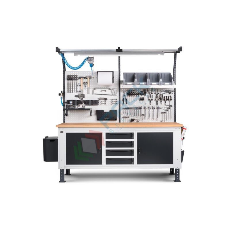 BANCO DA LAVORO CON PIANO IN LEGNO E GAMBE REGOLABILI, 200 CM Utensili ed attrezzatura non compresi nella composizione. Banco da lavoro in acciaio, realizzato con piano in multiplex 30 mm, Mis. 2000 L x 750 P x 740/1110 H mm, con gambe regolabili in altezza. Carico massimo del prodotto 1000 Kg. Fornito smontato. L'altezza del banco da lavoro con piano in multiplex può essere facilmente variata meccanicamente per regolare il piano di lavoro non solo in base alle lavorazioni da effettuare, ma anche secondo l'altezza dell'operatore. Il banco con piano in legno è una soluzione ideale per effettuare operazioni pesanti. Banco da lavoro regolabile in altezza e completo di pannello portautensili, piano di lavoro in legno, cassetti per banco e accessori vari. Per avere a disposizione tutto il necessario per il lavoro il banco in acciaio con gambe regolabili in altezza è stato arricchito da ganci Unipok per l'organizzazione degli utensili, accessori Iron Team per la sistemazione