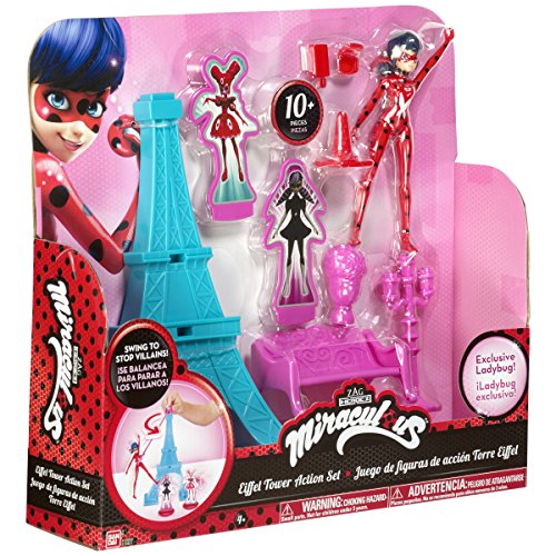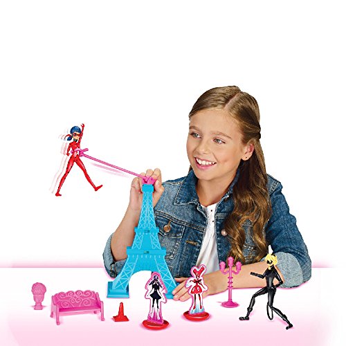 Questo playset contiene: 1 statuetta Torre Eiffel, 1 statuetta Ladybug 15 cm, 2 bersagli di cattivi