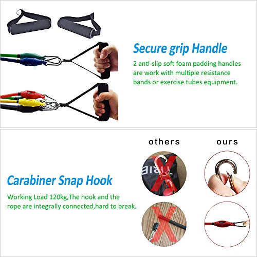 【 diversi livelli di resistenza progressiva 】 i diversi colori rappresentano diversi livelli di resistenza per livelli di allenamento della forza. 5 tubi di resistenza: giallo - 2,3 kilogram, 6,8 kilogram - 4,5 kilogram, blu - rosso, verde - 9,1 kilogram, 4,5 kilogram - 11,3 kilogram;