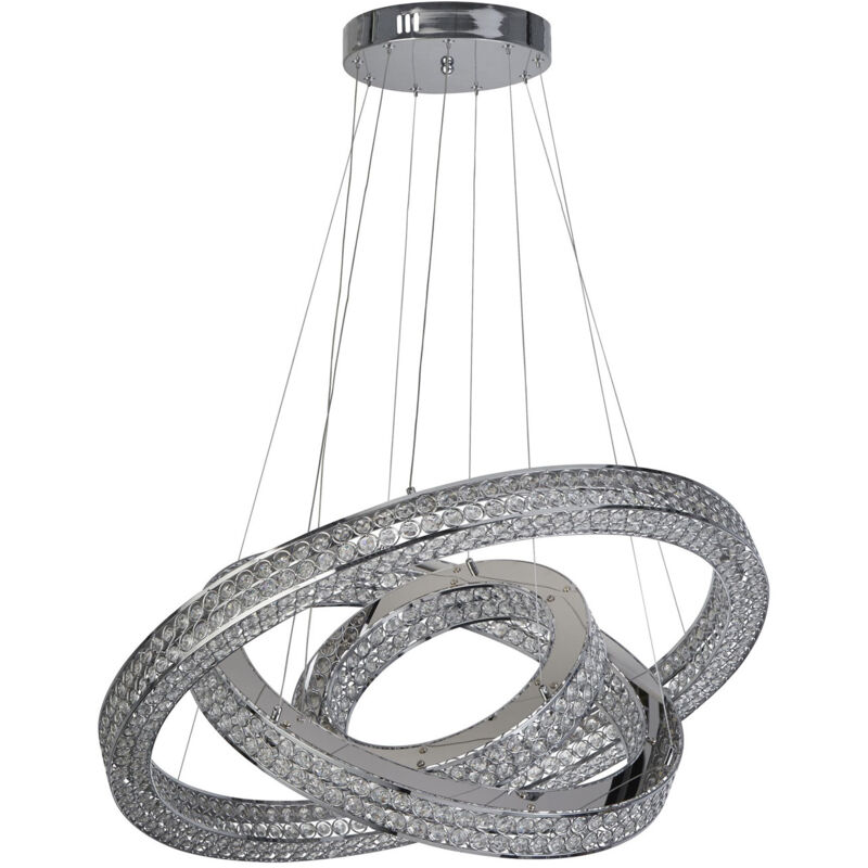 Searchlight Bands Sospensione LED 3 Luci, Cromo, Cristallo 4000K | Finitura: Cromata, Trasparente | Materiale: acciaio dolce, acciaio inossidabile, vetro | Grado di protezione IP: IP20 | Altezza massima: 150 cm | Lunghezza: 76 cm | Larghezza: 76 cm | Tipo di lampada: LED integrato | Lampadina inclusa: Sì | Dimmerabile: Sì | Kelvin: 4000K (bianco freddo) | Lumen: 3080Lm | Peso: 9 kg | Potenza (max): 90 W