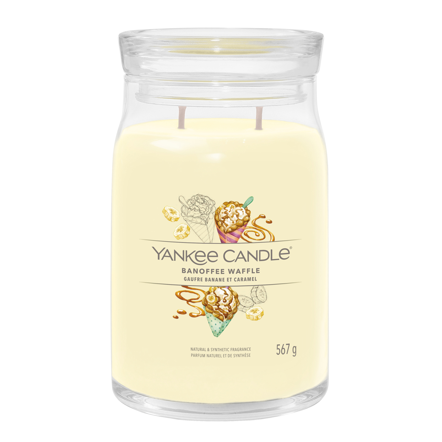 Un aroma di novità avvolgerà la stanza, donando all'ambiente una vitalità inebriante e creando un'atmosfera magica con la luce soffusa delle candele profumate Yankee Candle. L'iconica forma a giara è stata totalmente reinventata nelle forme e progettata con doppio stoppino per creare una migliore esperienza. Pratica e facile da usare, assicura fino a 90 ore di piacevole profumazione. Banoffee Waffle è una fragranza fruttata con note che richiamano un invitante waffle ricoperto di gelato alla banana, con tocchi al profumo di caramello e cioccolato. Note di testa al primo impatto: Crema alla banana, Limonata ghiacciata, Lime. Note di cuore, struttura principale della fragranza: Sorbetto alla banana. Note di fondo che costituiscono la struttura finale: Cioccolato, Vaniglia. Perfetta come idea regalo, offre una pausa rilassante e piacevole. La candela da 567 g è contenuta in pratico vasetto in vetro, resistente e riciclabile, di dimensione grande ed è dotata di tappo ermetico.