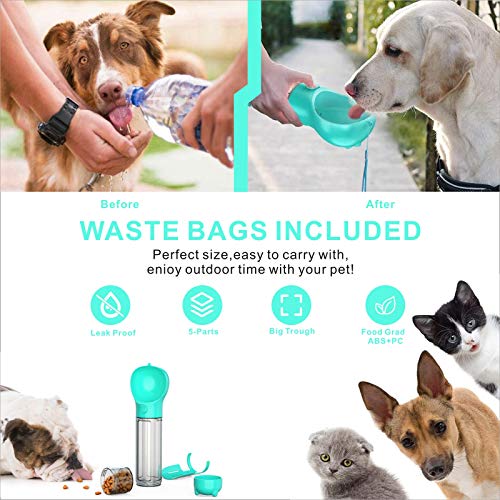 5 in 1 - Mulit-funzione: bottiglia d'acqua da 500 ml, contenitore per alimenti, contenitore per rifiuti, paletta per cani, ciotola per l'alimentazione. Acquista 1 ottenere 5 funzioni che è conveniente e pratico. Adatto per passeggiate a lunga distanza, escursioni e viaggi. I tuoi adorabili animali domestici possono gustare acqua fresca e cibo in qualsiasi momento e ovunque con questa bottiglia. E la pulizia della cacca sarà più facile e pulita. Un prodotto indispensabile per i vostri animali domestici.