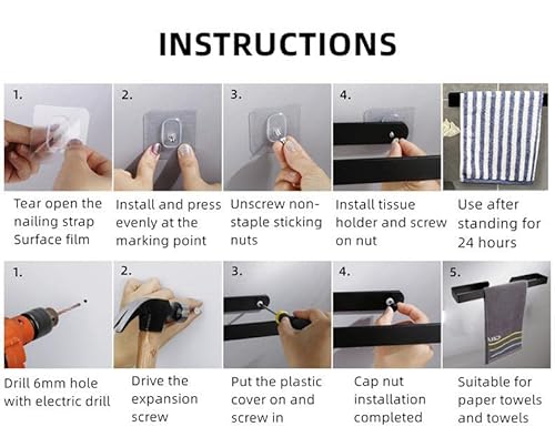 【Contenuto Della Confezione】 2 * ganci senza cuciture, 2 set di viti, 1 * 30 cm portasciugamani in acciaio inossidabile nero, il peso massimo del portasciugamani è di 8 kg.