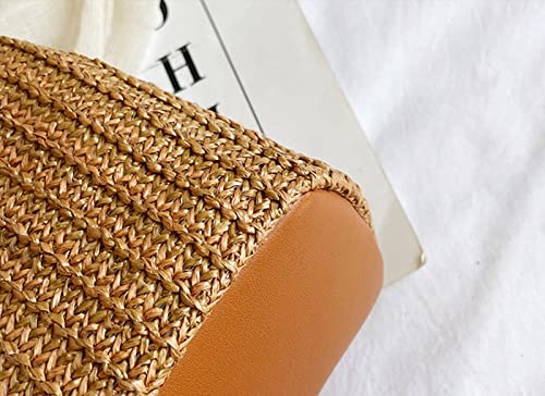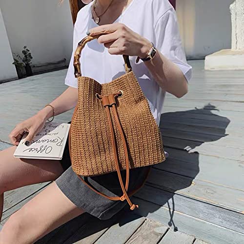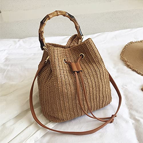 BAOZENGMUY Borsa di Paglia Borsa A Tracolla da Donna Borsa A Secchiello Intrecciata in Paglia con Coulisse Borsa da Spiaggia in Vimini con Manico in Vimini E Rattan Femminile 24X14X25 Cm Marrone