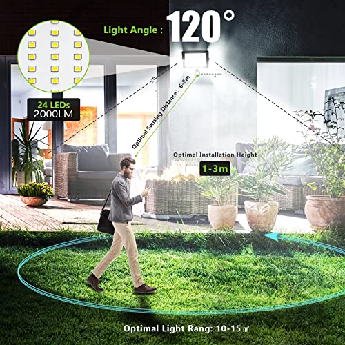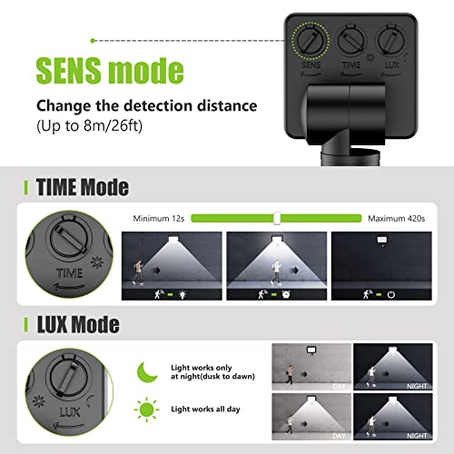 【Rilevatore di movimento regolabile】 Con il rilevatore di movimento PIR sensibile rileva ogni movimento fino a metri 8. Il sensore può essere ruotato orizzontalmente di 360 ° e verticalmente di 180 °. Se rilevi un movimento entro 8 m, l'illuminazione esterna si accende automaticamente. Grazie a 3 modalità di SENS, TIME e LUX, è possibile impostare la distanza di rilevamento (6-8m), l'orario di lavoro (0s-7min) e la sensibilità alla luce (giorno-notte).