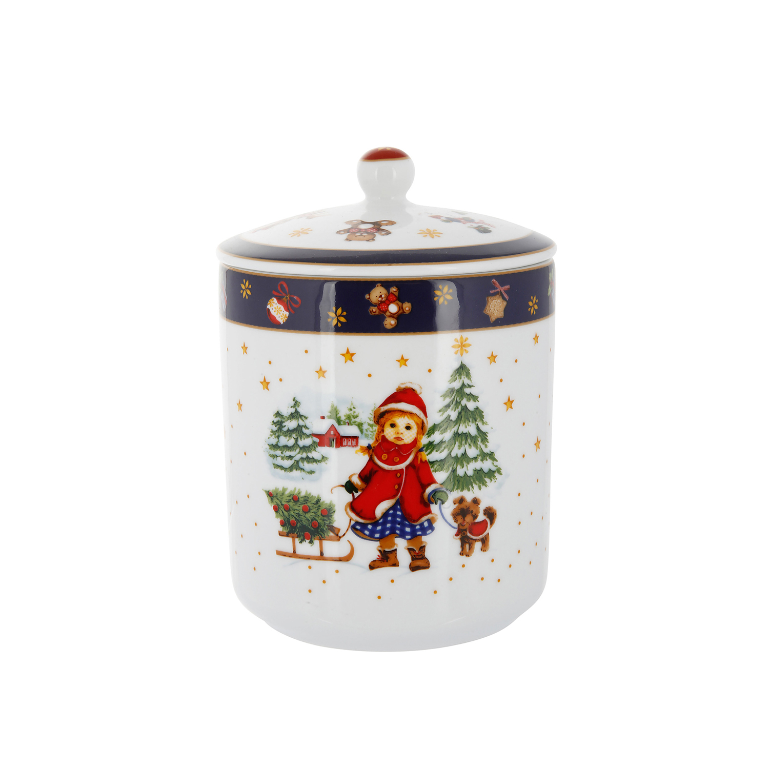 Un elegante barattolo in porcellana con allegri decori natalizi. Usalo per conservare biscotti e caramelle, portando in tavola tutta la magia e l'atmosfera del Natale, tra la gioia di grandi e piccini. Il coperchio è dotato di anello in silicone per garantire una chiusura ermetica e conservare al meglio i tuoi alimenti. Lavabile in lavastoviglie, ad esclusione del coperchio. Abbinalo agli altri elementi della linea per creare una mise en place natalizia inimitabile e unica. Dimensioni: 14x11 cm.