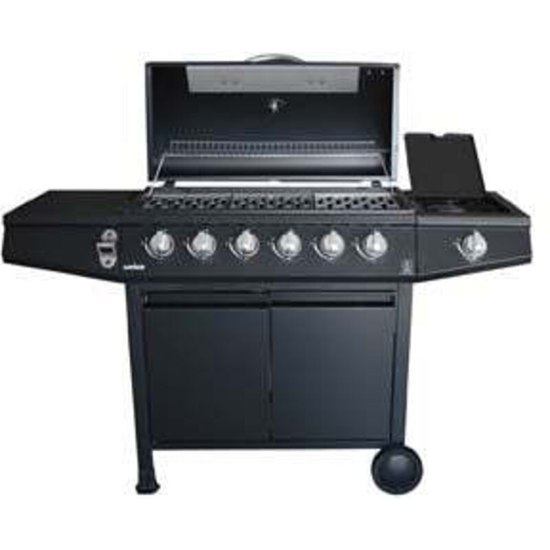 Materiale: acciaio verniciato - colore nero - zona cottura: cm.73,5x33 - coperchio acciaio verniciato ad alta termperatura - 3 griglie di cottura: acciaio inox cm.24,5x33h. - frontale acciaio verniciato - 6 bruciatori ss201 - 4 armadi - termometro - poten