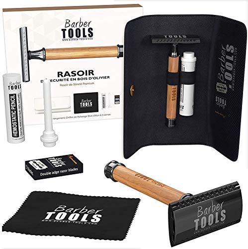 BARBER TOOLS Kit da barba Rasoio di sicurezza + Scatola da 40 doppie lame + Pennello da barba + sapone da barba 150ml + Balsamo dopobarba 30ml + Pietra di allume + Grande custodia