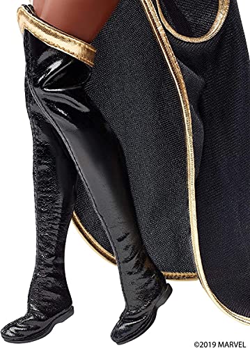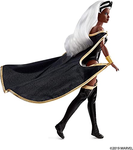 Storm Barbie è elettrizzante quanto il personaggio che emula, con una tuta nera lucente, mantello e stivali alti neri con bordo dorato. I dettagli includono guanti, copricapo e una spilla con una pietra.