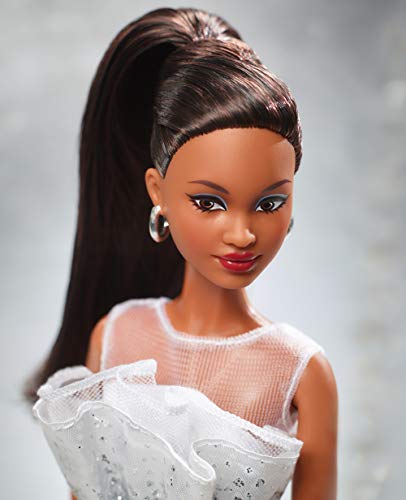 Per commemorare il suo anniversario di diamanti, lo splendido design della bambola Barbie del 60° anniversario brilla con scintille argentee e accenti ispirati al diamante.