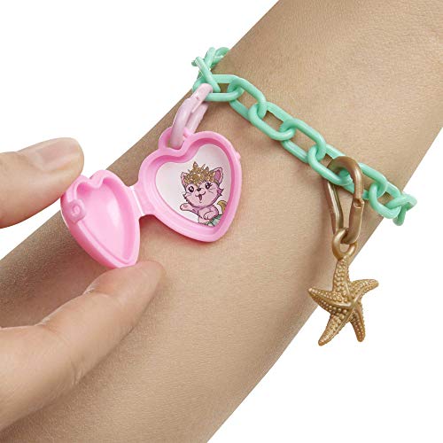 Aprendo questo set con tanti pezzi, i bambini potranno trovare una bambola Barbie Color Reveal e un cucciolo Color Reveal, entrambi con rivestimento rosa removibile, 2 look completi ispirati alle sirene, 4 oggetti con l'effetto cambia colore, glitter e slime in una scatolina a forma di cuore, un bracciale per bambini con 2 ciondoli e un adesivo