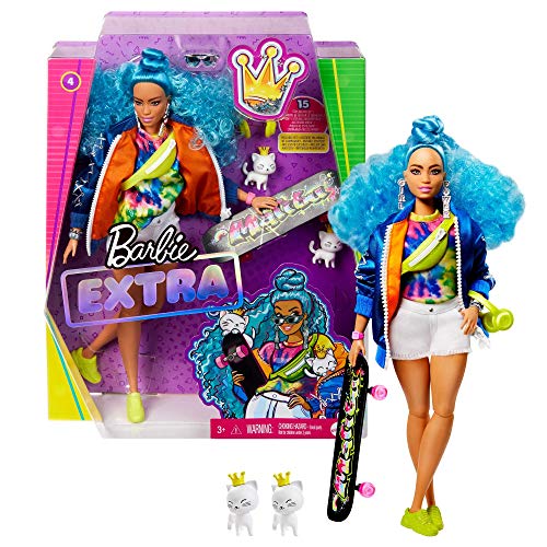 Barbie Extra Bambola Curvy con Capelli Ricci Azzurri, Cucciolo e Accessori alla Moda, Giocattolo per Bambini 3+Anni,GRN30