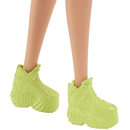 Barbie - Fashionistas N 190 Bambola con Capelli Biondi e Ciocche Viola, Abito, Sneaker Gialle con Zeppa, Bracciale, Giocattolo per Bambini 3+ Anni, HBV22