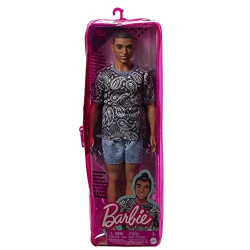 Barbie - Barbie Fashionistas, bambola Ken con capelli castani raccolti in uno chignon, t-shirt e shorts con motivo cachemire, abiti e accessori, giocattolo per bambini 3+ Anni, HJT09