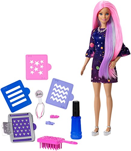 Usa il porta-stencil per posizionare uno dei quattro stencil sui capelli e crea nuovi stili spruzzando i capelli di Barbie utilizzando la boccetta spray inclusa
