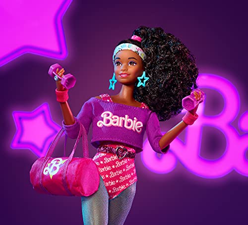 Gli accessori totalmente anni '80 includono manubri, una borsa da viaggio, uno stepper aerobica e una spazzola per capelli Barbie retrò.