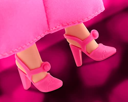 Pronta a ballare tutta la notte, la bambola Barbie è vestita con un favoloso abito da sera rosa con un boa scintillante con volant.