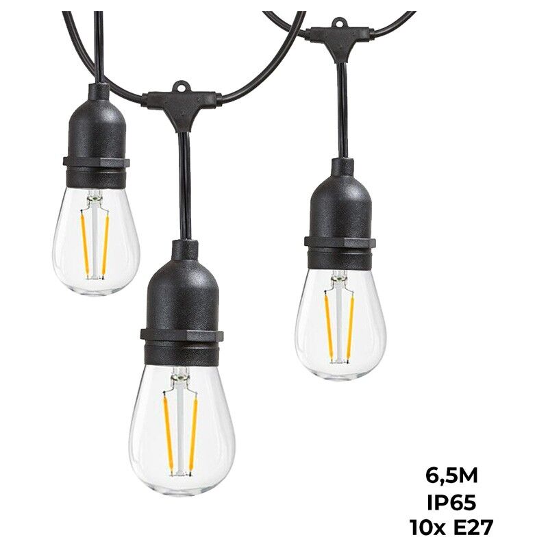 Ghirlanda di luci per esterni con 10 prese, con una distanza tra le lampadine di 50 cm. Dotato di spina Schuko europea. È dotato di un connettore maschio/femmina all'inizio e di un connettore femmina all'estremità per facilitare il collegamento dei cavi. La stringa può essere interconnessa in serie, in modo che diverse unità possano essere collegate tra loro per ottenere lunghe percorrenze. Grazie al grado di protezione IP65, il prodotto è adatto all'installazione all'esterno. Cavi, spine, connettori e prese sono protetti da fattori esterni come umidità, pioggia, polvere e particelle in generale. Lampadine a LED non incluse ** Lampadine a LED non incluse ** Lampadine a LED non incluse ** Lampadine a LED non incluse ** Lampadine a LED non incluse