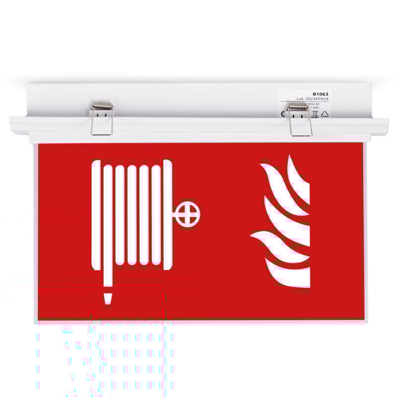Luce di emergenza da incasso, con pittogramma in acetato che indica la posizione dell'idrante. Questo apparecchio rimane sempre acceso, anche in caso di interruzione di corrente, offrendo fino a 3 ore di autonomia. Con indicatore di funzionamento a LED. Viene incassata a soffitto e comprende tutti gli elementi necessari.