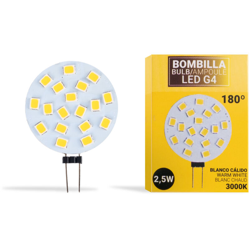 Lampadina LED bispina G4 di alta efficienza e qualità, ideale per sostituire le lampadine alogene bspina, con un risparmio energetico che può superare l'85%. Con una potenza di 2.5W, offre una luminosità di 300 lumen. Particolarmente indicata per veicoli, caravan, barche, luci di segnalazione e campeggio. Disponibile nelle tonalità bianco caldo (3000K), bianco neutro (4000K) e bianco freddo (6000K).