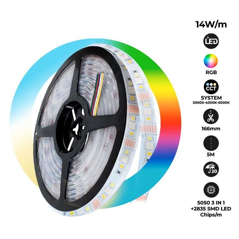 Striscia LED RGB+CCT 14W/m - 24V - IP20 dotata di CHIP 5050 (RGB) 3 in 1 + 2 2835 SMD, questi nuovi chip offrono una luminosità molto più uniforme e la possibilità di lavorare in tutti i tipi di colori e bianchi. La striscia LED è una scheda flessibile su cui sono montati diodi semiconduttori a emissione luminosa (LED), dotata di un supporto flessibile. Offre una moltitudine di possibili combinazioni di luce, con intensità e colore variabili, per illuminare qualsiasi area della casa e creare ambienti diversi, grazie al grado di protezione IP20. Lunghezza 5 metri Larghezza della striscia 12 mm Potenza: 14W /m Chip LED 5050 3 in 1 + 2835 SMD LED RGB+CCT: multicolore + bianco dimmerabile tra 2700K-6500K.