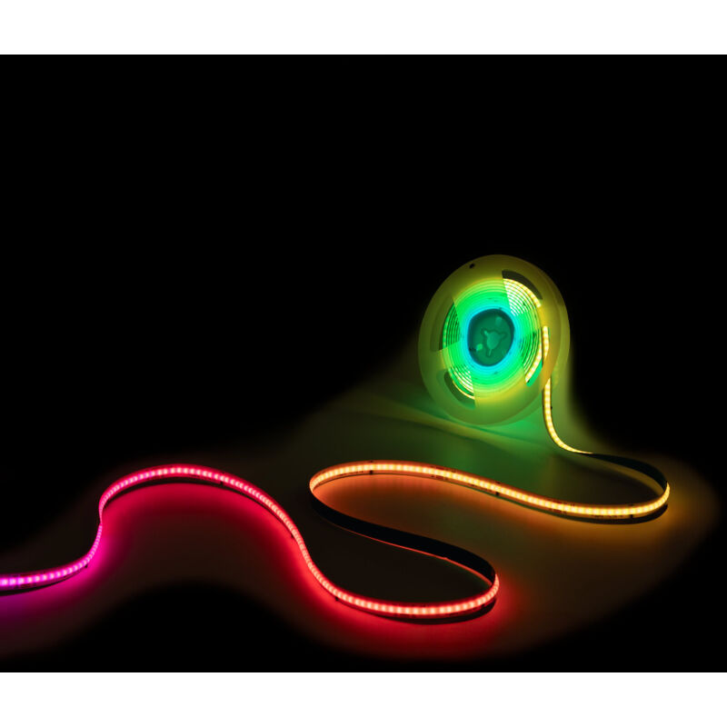 La striscia LED COB fornisce un'illuminazione brillante e uniforme, senza ombre o punti luce visibili, a differenza delle strisce LED tradizionali. Ogni chip LED è dotato di una propria sorgente luminosa e di un driver integrato (IC), che consente il controllo individuale di ciascun LED della striscia. In questo modo, può essere programmata per creare schemi di luce personalizzati. Con una densità di 360 LED/m, offre un'illuminazione efficiente e di alta qualità (100lm/W). Trattandosi di una striscia LED RGB, offre molteplici possibilità di colori e personalizzazioni.