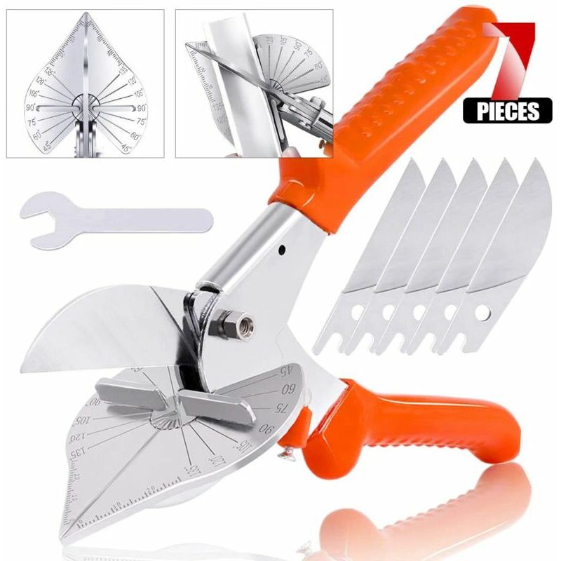 ACCIAIO INOSSIDABILE PREMIUM - Acciaio inossidabile temprato Trattamento agli urti superiore e resistenza all'usura con lame di ricambio SK5 da 5 pezzi e chiave da 1 pezzo [Buone prestazioni] Da 45 gradi a 135 gradi, taglio piacevole e pulito, senza sbavature. Design a bocca aperta e marcatura chiara per regolare l'angolo desiderato, funzionamento facile e preciso. Questo ti evita molti problemi a misurare l'angolo che stai cercando di tagliare. Regolabile, conveniente, veloce ed efficiente.[Ampiamente usato] Strumento per tagliare tubi di plastica, modanatura di scarpe e oggetti più morbidi, decorazioni per la casa, produzione di cornici per foto, attività di lavoro quotidiane o persino progetti fai-da-te. Sono anche conosciute come frese a taglio, smussatura, rifinitura e quarto di tondo.[Forte e facile da usare] La taglierina ha uno stencil integrato per tagli angolati. Taglia liscio e pulito. Il taglio obliquo multiangolo di incredibile precisione è perfetto per il taglio di 1/4