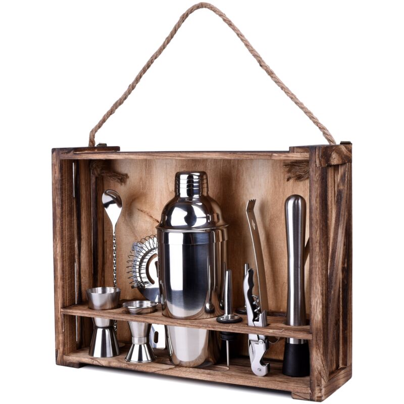 LOGAN set barista scatola 11 elementi Colore: nero Stai organizzando una festa e vuoi sorprendere i tuoi ospiti? Il set barista ti aiuterà a dare inizio alla festa e a preparare drink originali e interessanti. Ogni elemento del set è realizzato in acciaio inossidabile di altissima qualità, quindi non altera il gusto delle bevande. Il set comprende ben 11 elementi: 10 accessori in acciaio inossidabile e un supporto in legno di pino carbonizzato. Vantaggi dell'acciaio inossidabile 304 di alta qualità, il set contiene ben 11 elementi, non altera il gusto delle bevande, un'ottima idea regalo, gli elementi in acciaio sono lavabili in lavastoviglie, ganci per appendere la scatola al muro contenuto: 1x shaker da 550 ml, 1x pestello da barista (muddler), 1x cucchiaio da barista lungo, 1x colino da bartending 1x pinza per ghiaccio 1x cavatappi/apriscatole 1x misurino a doppia faccia 30 ml/ 50 ml (Jigger) 1x misurino a doppia faccia 15 ml/ 30 ml (Jigger) 2x versatore 1x scatola di legno