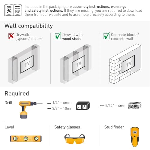 ► Installazione rapida e facile: la consegna include una guida dettagliata all'installazione oltre al materiale di montaggio standard. Questo ti aiuta a installare questo supporto da parete TV senza problemi. Può essere montato su pareti in cemento massiccio, pareti in mattoni o pareti in legno massello (non installare il prodotto su pareti in gesso, pareti cave, cartongesso o pareti morbide).