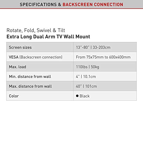 Barkan Supporto da parete per TV lungo 40", 13-80", con doppio braccio articolato - 4 movimento piatto / curvo, supporta fino a 50 kg, extra stabile, adatto a LED OLED LCD