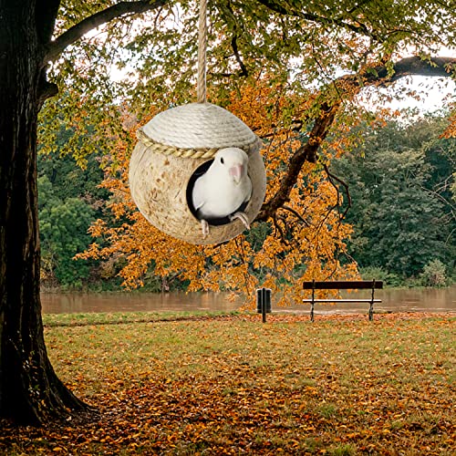 【Può essere Appeso e Riparato】 Il nido di uccelli con guscio di cocco con corda di canapa, fissato alla parte superiore della gabbia per uccelli, può essere facilmente appeso all'interno o all'esterno, può anche essere appeso a un ramo di un albero.