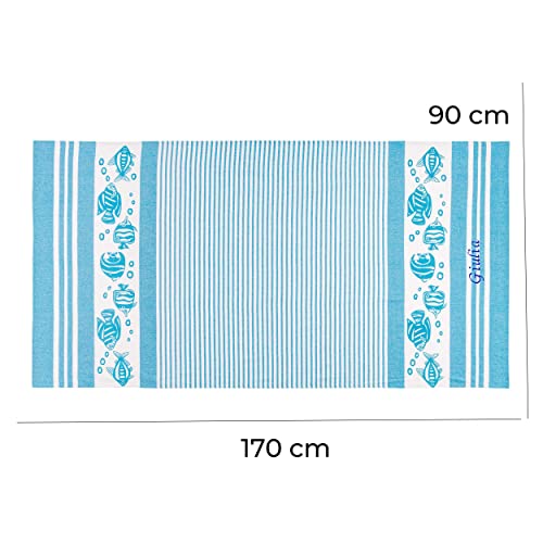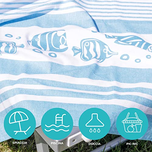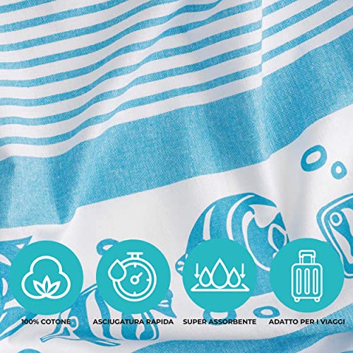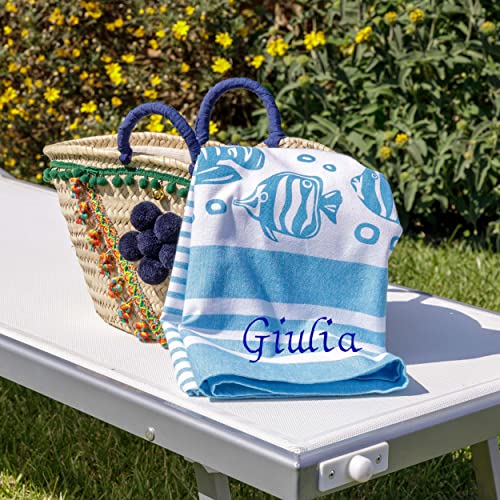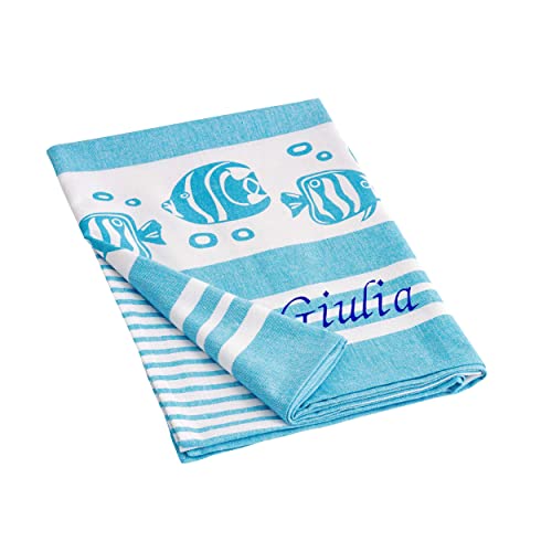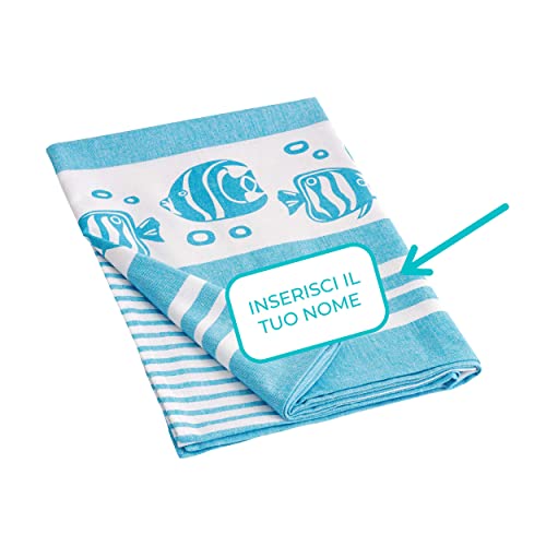 Baroni Home Telo Mare con nappe colorate, Pareo, Telo da Yoga, Asciugamano da Spiaggia Hammam, Super Assorbente e Asciugatura Rapida, Ecologico, 90x170 cm (Pesci Azzurri Personalizzabile)