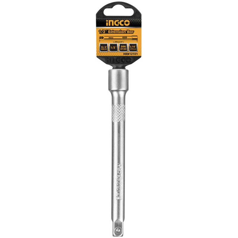 BARRA ESTENSIONE 250MM 1/2 POLLICE "INGCO" Barra estensione 1/2“ Lunghezza 250 mm Materiale 40CR Trattamento termico, cromato Appendibile