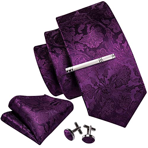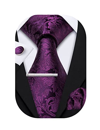 Barry.Wang - Set di cravatte da uomo in seta, con fazzoletto e gemelli, a righe, per matrimoni e feste, viola scuro, Taglia unica