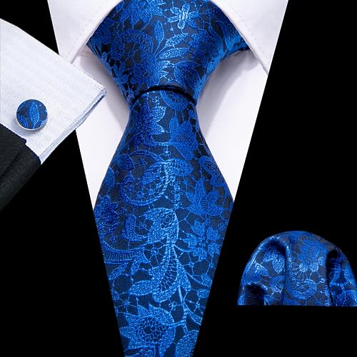 Barry.Wang Uomo Cravatta Set Seta Tessuto Cravatta Tasca Quadrato Gemelli Business Wedding, Blu reale tinta unita., Taglia unica