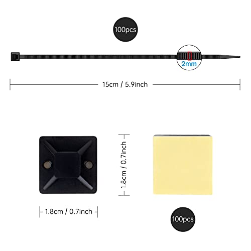 Base adesiva per fascette stringicavi, 100 pezzi, 20 x 20 mm, autoadesive e 100 fascette stringicavi, base adesiva per la gestione di tutti i tipi di cavi (nero)