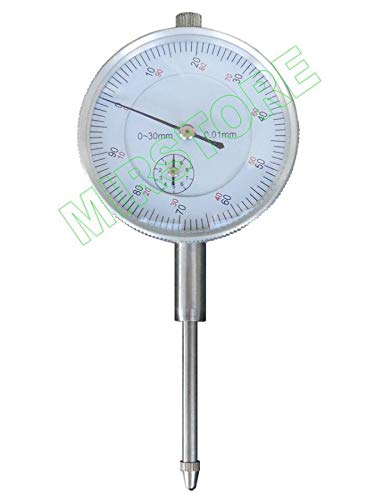 Comparatore centesimale con quadrante bianco diametro 60 mm di facile lettura protetto da vetro con ghiera girevole. Campo di misura da 0 a 30 mm, risoluzione 0,01 mm.