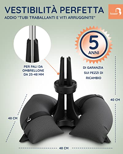 SPECIFICHE: Adatta a pali rotondi tra 25 e 48 mm. 30 KG per ombrelloni con tettoia fino a 2,8 m. 40 kg con tettoia fino a 3 m e 50 KG con tettoia fino a 3,3 m. NOTA: Il palo o la sabbia non sono inclusi. NON adatta per ombrelloni decentrati!