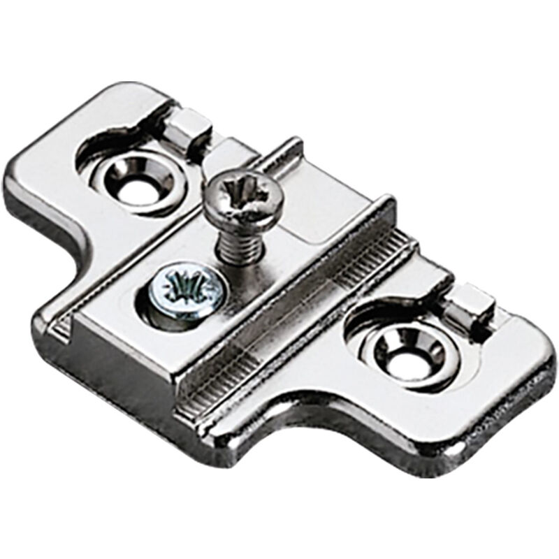 Regolazione verticale mediante eccentrico. Foratura 20x32 mm. In acciaio e zama. Adatta per cerniere serie '300'.