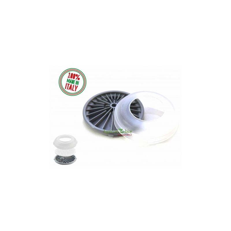 KIT Filtro antipolvere, fumi e nebbie (con dischetto monouso) P2 NR - art. 2002 + cop2002 + bar2002 Kit: Basetta + Filtro + Coperchio di protezione P2 . Si tratta di un Kit composto da 3 articoli acquistabili separatamente o insieme (COP2002, 2002, BAR2002).A . Il dischetto filtrante deve essere utilizzato solo una volta, in quanto A idoneo ad una sola applicazione. . Il KIT puA essere applicato alla maschera EtnaA grazie al raccordo a baionetta presente nella Basetta. Protezione P3, protegge da: . Polveri . Nebbie . FumiA