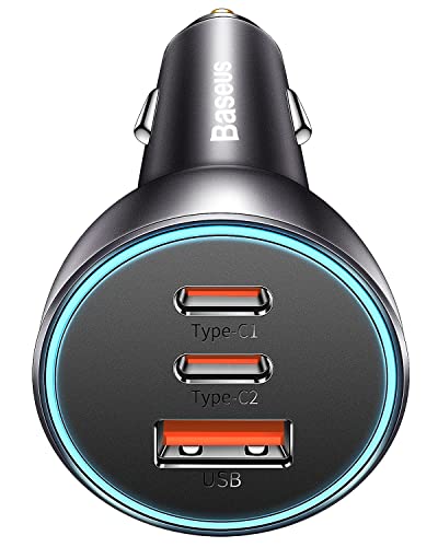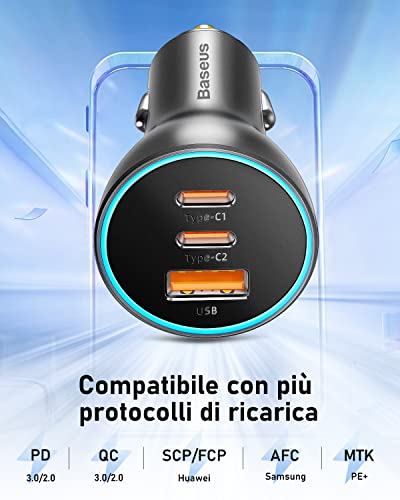 ⚡【Ricarica rapida PD3.0 da 65 W】 Caricabatteria per auto USB-C Baseus da 65 W compatibile con caricabatterie per auto a ricarica rapida PD3.0 QC3.0, tecnologia di ricarica rapida indipendente a 3 porte 25 W + 20 W + 20 W. Le prestazioni della porta singola non diminuiscono quando vengono utilizzate 3 porte contemporaneamente e possono caricare rapidamente 3 dispositivi contemporaneamente. La potenza massima di 25 W del connettore Type-C1 può caricare il tuo iPhone13 Pro Max al 50% in 30 minuti.