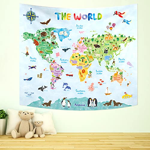 BASHOM TP-001 Poster con Mappa del Mondo degli Animali per Bambini Apprendimento Educativo Appeso a Parete per Camera da Letto Soggiorno Asilo Nido Dormitorio Home Decor 60''x50'' (150x130 cm)