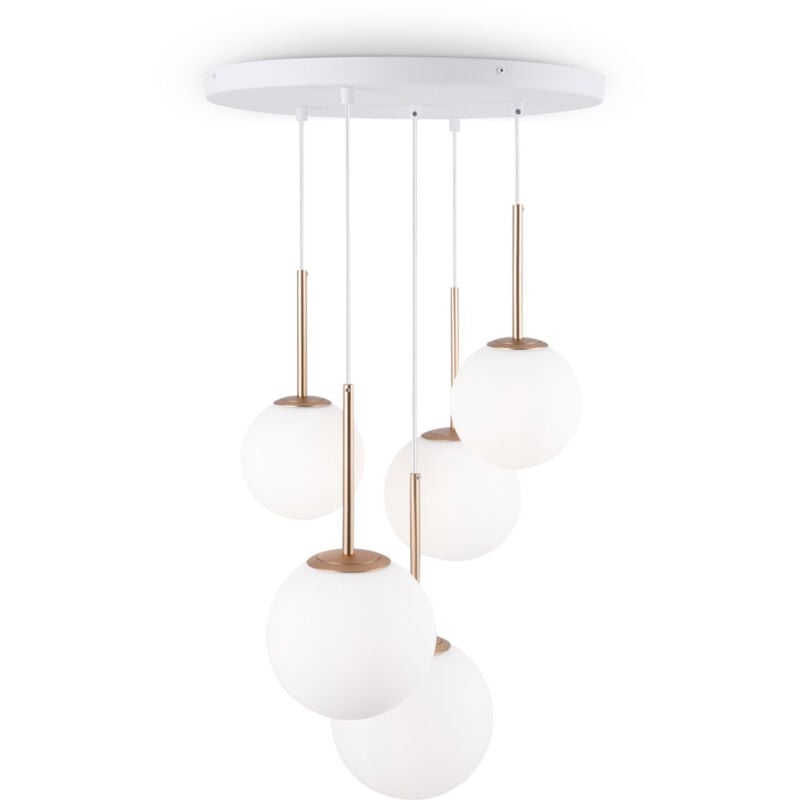 Collezione Basic Form IL MINIMALISMO COME IDEA DI STILE Lampadario minimalista con una struttura in metallo bianco e oro con 5 luci, diffusori in vetro. Design essenziale e pulito per ambienti moderni e minimal . La presenza di 5 luci garantisce un'illuminazione adeguata e uniforme, mentre i diffusori in vetro assicurano una diffusione omogenea della luce, evitando fastidiosi riflessi. Il design del lampadario è essenziale e pulito, perfetto per ambienti moderni e minimalisti. Le forme universali, infatti, permettono di integrarlo facilmente in qualsiasi contesto, senza risultare mai invadente o eccessivo. Le plafoniere tonde, poi, contribuiscono a creare un'atmosfera di grande eleganza e raffinatezza, grazie alla loro capacità di diffondere una luce morbida e delicata, che non stanca mai la vista. Nel complesso, dunque, questo lampadario minimalista rappresenta una soluzione ideale per chi cerca un'illuminazione funzionale e di grande impatto estetico, senza rinunciare alla