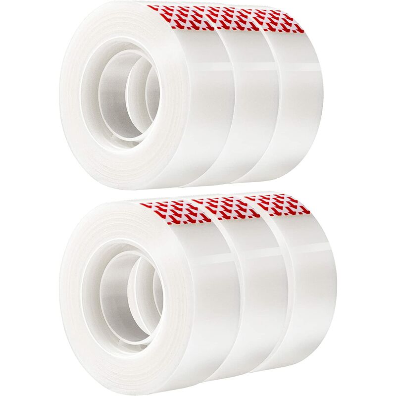 Confezione da 6 rotoli di nastro adesivo invisibile per l'uso a casa, a scuola o in ufficio Ideale per l'uso quotidiano, in particolare per riparare la carta, attaccare foto o adesivi, appunti, sigillare buste, bricolage progetti, ecc. La sua larghezza di 2 cm e la struttura acrilica leggera lo rendono facile da usare a qualsiasi età La finitura opaca conferisce un aspetto invisibile senza cuciture a questo nastro, che può essere scrivi con penna, matita o pennarello L'adesivo a base d'acqua è facile da rimuovere e non danneggia le foto, è una buona alternativa alle colle disordinate
