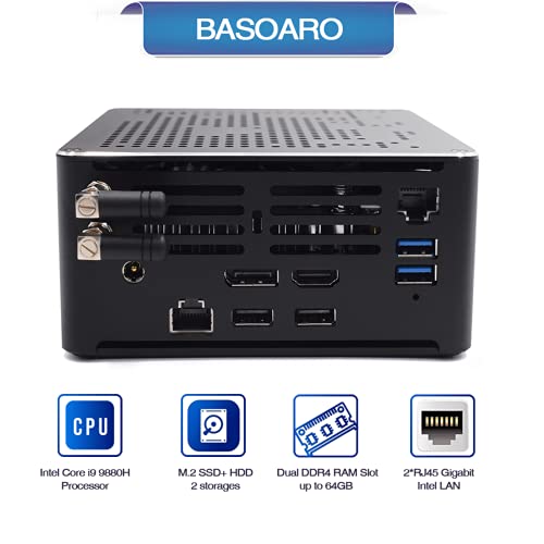 BASOARO Mini PC Desktop, Micro Desktop Core i9 9880H, 32G RAM 512G SSD 1TB HDD, Gigabit Ethernet, DP/HD, WiFi, BT, Supporto di Accensione Automatica